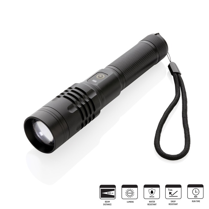 Con una linterna de aluminio recargable por USB, tú ofreces una solución de iluminación moderna y potente. Su capacidad de recarga elimina la necesidad de pilas, proporcionando comodidad y sostenibilidad. El cuerpo de aleación de aluminio de alta calidad asegura durabilidad. La luz de enfoque premium te permite extender la luz hasta 2000 veces, ideal para inspecciones detalladas. Con una clasificación IP4, es resistente a la intemperie, perfecta para técnicos de seguridad, logística o ingenieros. La potente bombilla crea hasta 1000 lúmenes y un haz que alcanza hasta 500 metros, con 5 modos, incluida la función SOS. La batería de 2000 mAh permite un uso de hasta 4 horas con una sola carga. Esta linterna posiciona tu marca como innovadora y eficiente, demostrando un compromiso con la tecnología avanzada y la utilidad práctica, lo que fortalece tu imagen y la lealtad.