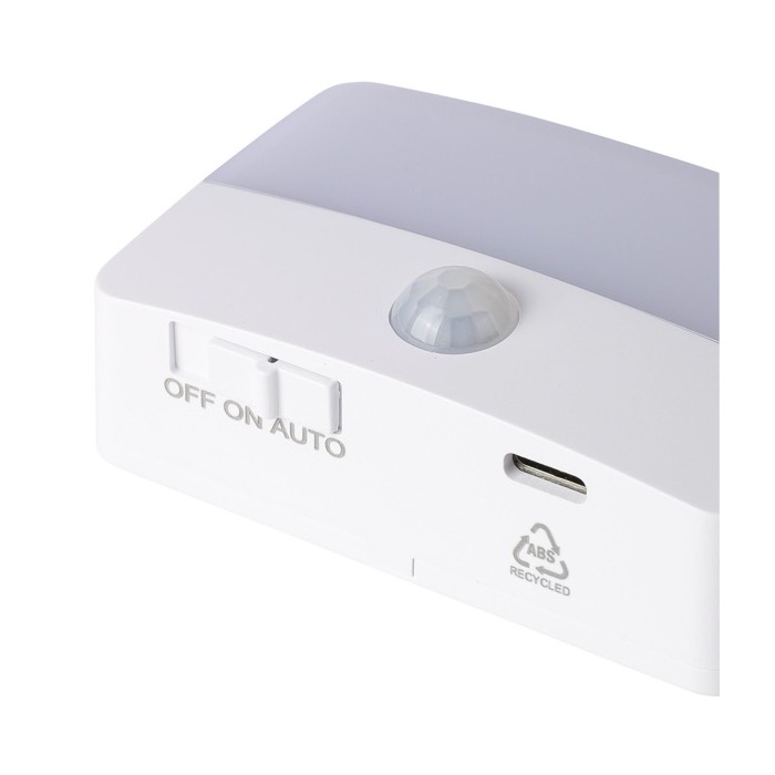 Luz recargable de plástico en formato rectangular, pensada para iluminar zonas de paso con encendido inteligente. Incorpora sensor de movimiento con ángulo de 120° y detección entre 3 y 6 metros, activándose en la oscuridad y apagándose de día de forma automática. Ofrece 30 lúmenes para una señalización clara en pasillos, escaleras o almacenes. Incluye batería de 500mAh y carga USB-C para una recarga cómoda. Parte trasera con imán, placa metálica y cinta autoadhesiva, además de orificio para colgar. Adecuada para acciones de marca en oficina o eventos.