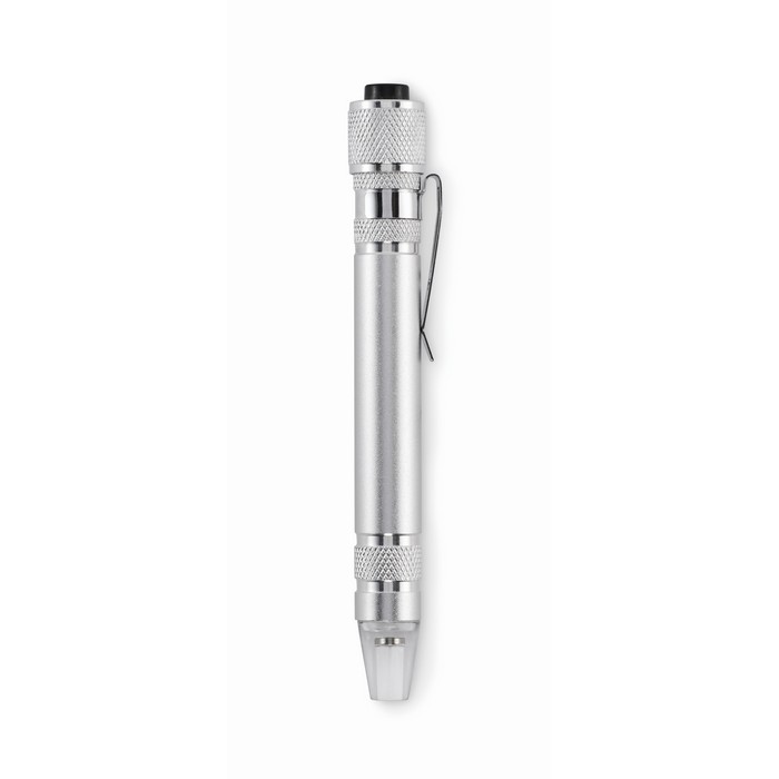 Multiherramienta de aluminio en forma de bolígrafo y con linterna