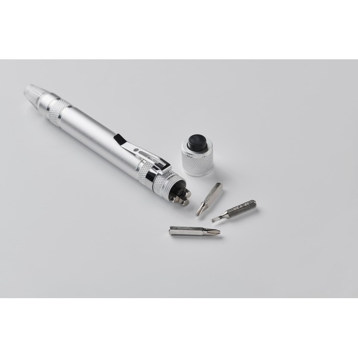 Con una multiherramienta en forma de bolígrafo que incluye destornilladores y una linterna, tú ofreces una solución compacta para pequeñas reparaciones. Fabricada en aluminio reciclado, destaca por su compromiso con la sostenibilidad. Incluye 3 destornilladores ranurados y 3 de estrella, ampliando su versatilidad para diversas tareas. Además, viene con 4 pilas de botón LR41, asegurando su uso inmediato. Es un obsequio muy apreciado por técnicos, personal de mantenimiento o cualquier persona que valore la preparación. Tus clientes la utilizarán para ajustes rápidos o para iluminar espacios reducidos, manteniendo tu marca siempre a mano.