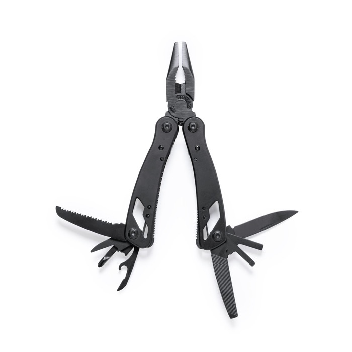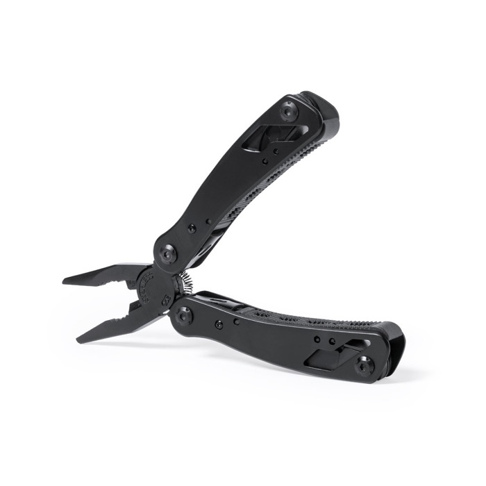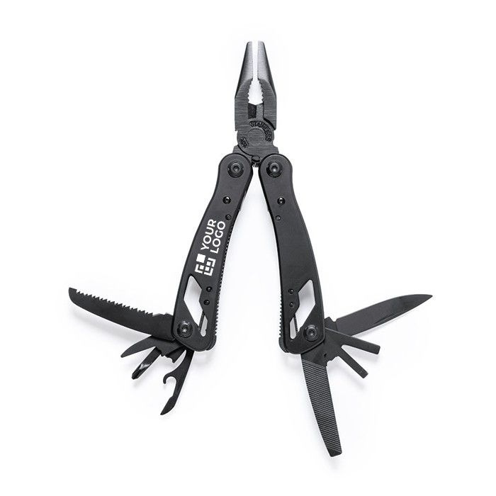 Multiherramienta fabricada en acero inoxidable con un elegante acabado negro y una empuñadura resistente de aluminio. Ofrece 12 funciones esenciales, incluyendo un cuchillo, navaja, destornillador, lima, abridor y alicates, todo en un diseño plegable que facilita su transporte y almacenamiento. Se presenta en una caja individual de diseño negro, ideal para mantenerla protegida y lista para su uso. Esta herramienta es perfecta para empresas que buscan soluciones prácticas y versátiles para el mantenimiento diario o como un regalo corporativo útil y apreciado por su funcionalidad y diseño compacto.