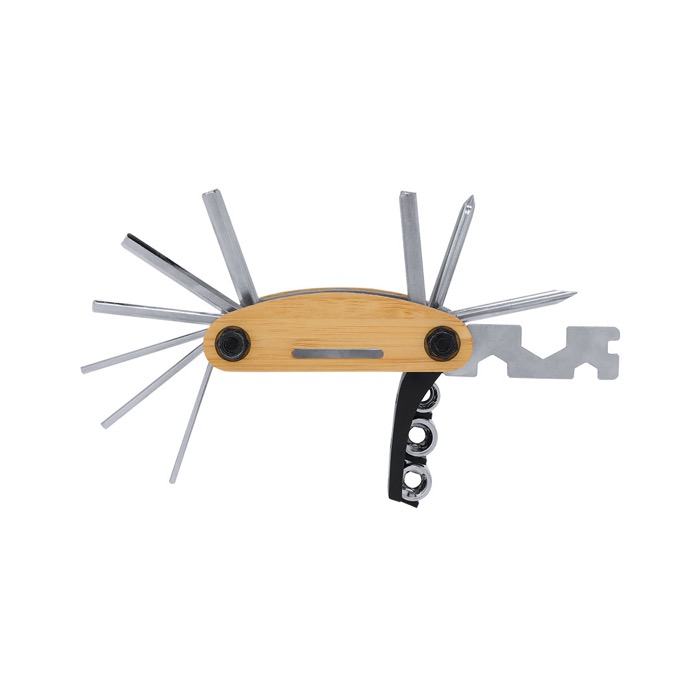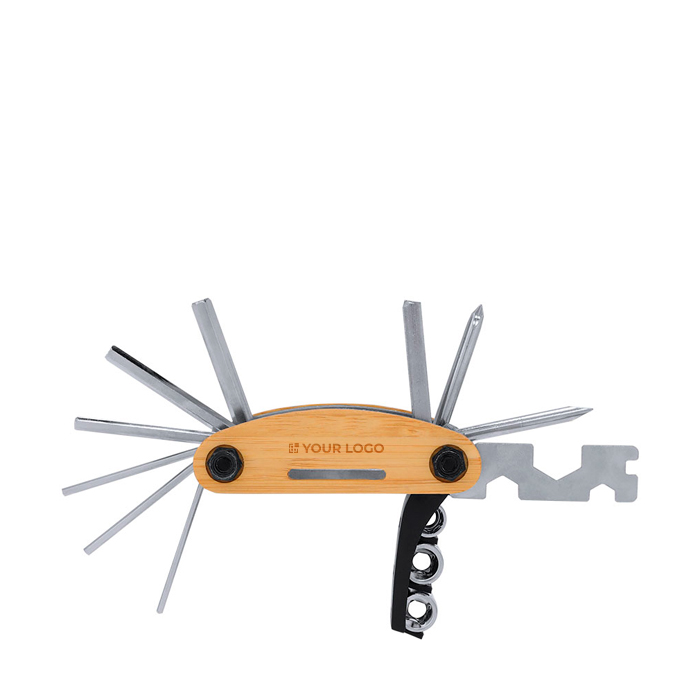 Multiherramienta fabricada en resistente acero inoxidable con una elegante carcasa de bambú. Ofrece 15 funciones esenciales, incluyendo llaves Allen y hexagonales, destornilladores plano, estrella y Phillips, además de un adaptador de tubo para tuercas hexagonales y llaves de vaso. Su diseño compacto y versátil la hace ideal para cualquier situación, permitiendo a los profesionales tener siempre a mano el utensilio adecuado. Perfecta para empresas que buscan una solución práctica y eficiente para el mantenimiento y reparaciones rápidas. Útil en kits de herramientas corporativas o como obsequio funcional para clientes y empleados.
