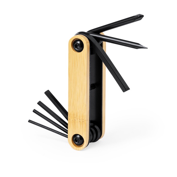 Multiherramienta fabricada en resistente acero al carbono con un elegante acabado en color negro y una carcasa de bambú. Ofrece 7 funciones esenciales, incluyendo llaves allen y destornilladores plano y Philips, lo que la convierte en una herramienta versátil para cualquier tarea. Su presentación en una caja de diseño kraft añade un toque de distinción y profesionalismo. Ideal para empresas que buscan soluciones prácticas y eficientes en el mantenimiento de sus instalaciones o para incluir en kits de herramientas corporativas.