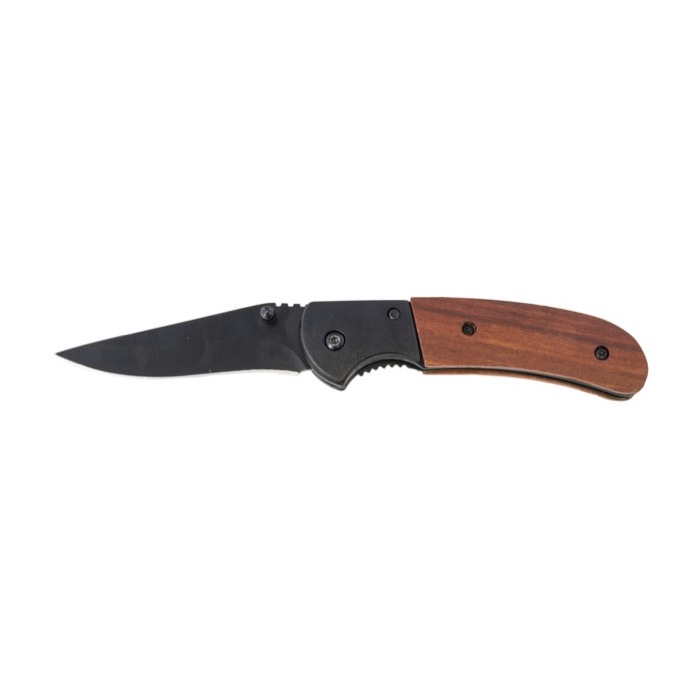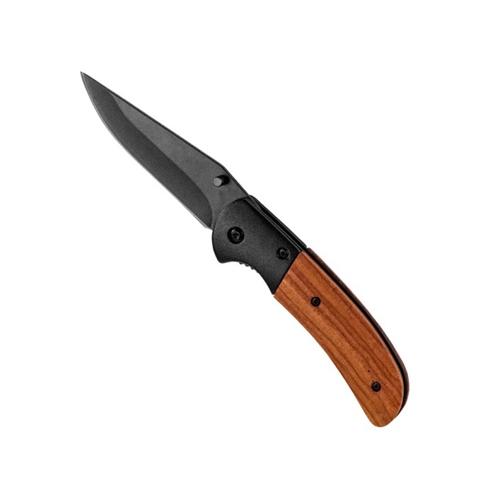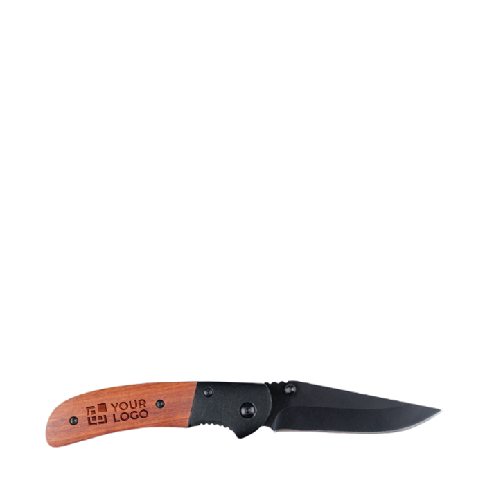 Para los aficionados a las excursiones y al aire libre, esta navaja con empuñadura de madera y filo negro de acero inoxidable les puede resultar de lo más útil. Se trata de un producto de merchandising nacido para romper patrones y que, además, al entregarse en caja de cartón forrado negro transmite una imagen de seriedad y profesionalidad que otros artículos promocionales no consiguen. Puede personalizarse mediante grabado láser o serigrafía.