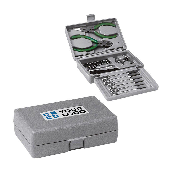 Set de herramientas de 25 piezas fabricado en plástico resistente. Incluye pinzas, seis destornilladores, alicates y alicates de punta fina, además de un adaptador y diez cabezas de destornillador. Cuatro compartimentos vacíos permiten personalizar el contenido según las necesidades. Todo se presenta en una caja de plástico compacta y duradera, ideal para mantener el orden y facilitar el transporte. El servicio Express asegura una entrega rápida y eficiente. Perfecto para personalizar con el logo de la empresa, este set es ideal para eventos corporativos o como herramienta promocional en campañas de marketing.