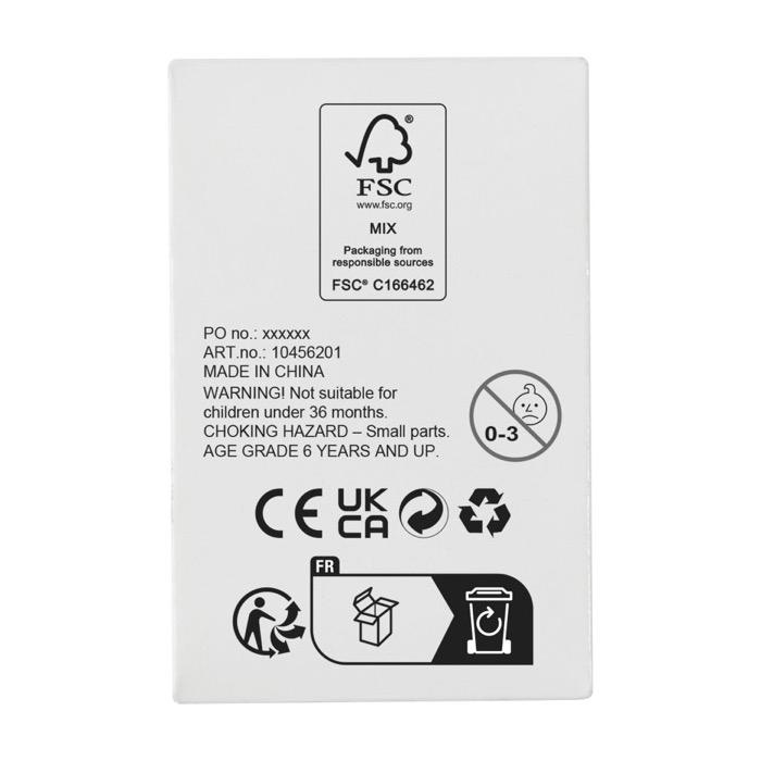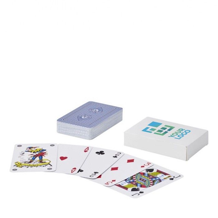Una baraja de cartas clásica, presentada en una caja de papel, es una opción sencilla y efectiva para tu estrategia de marketing. Con 54 naipes, incluidos 2 comodines, puedes emplearla en campañas de gran volumen o como un detalle en eventos masivos, llegando a un público amplio. La familiaridad del juego asegura su uso frecuente, manteniendo tu logotipo visible en diversos entornos sociales y familiares. Además, la caja de papel certificado de fuentes sostenibles refuerza tu compromiso con el medio ambiente. Es una forma práctica de reforzar el reconocimiento de tu marca, asociándola con momentos de ocio compartidos y accesibles para todos.