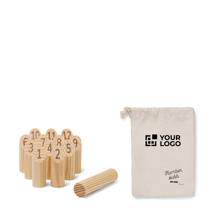 Juego de números Muge en miniatura, fabricado con madera de pino certificada por el FSC (Forest Stewardship Council). Este juego táctico incluye doce bolos numerados y un bolo para lanzar, ofreciendo un diseño simple y atemporal. Ideal para llevar y jugar en cualquier lugar, el objetivo es ser el primero en alcanzar exactamente 50 puntos. Se presenta en una bolsa de lona con parte posterior de malla, facilitando su transporte. Las instrucciones están incluidas para un inicio rápido. Perfecto para actividades de team building o eventos corporativos, promoviendo la interacción y el trabajo en equipo.
