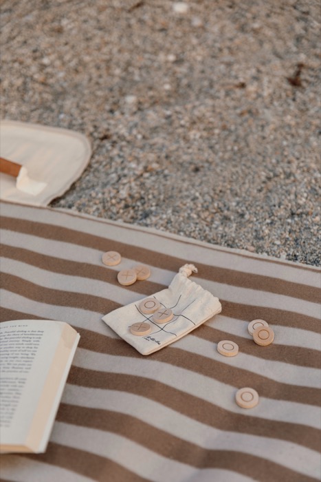 Juego de tres en raya de madera con tablero en bolsa de algodón
