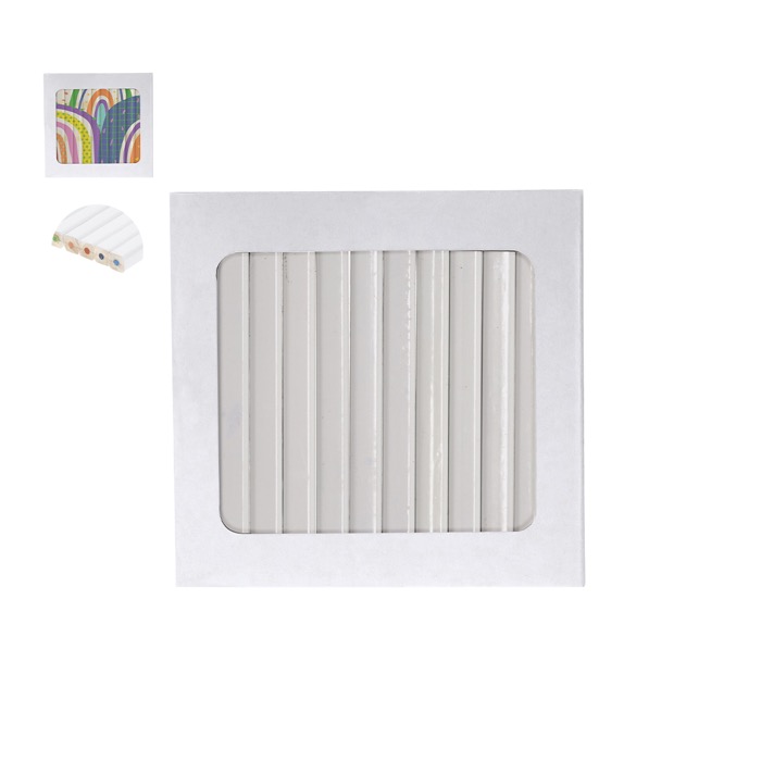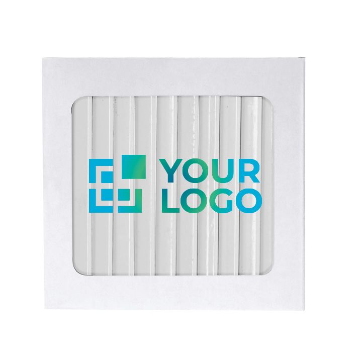 Lápices de madera con acabado blanco y cuerpo hexagonal, presentados en una caja de cartón con cierre de solapa. Incluyen minas en varios colores para cubrir usos habituales en oficina, formación o actividades creativas. El diseño del cuerpo está pensado para grabado digital, facilitando una personalización nítida con logo, nombre de evento o mensaje interno. El estuche ayuda a mantener el conjunto ordenado y listo para entregar. Recomendados para acciones de marca en ferias, academias o campañas de bienvenida.
