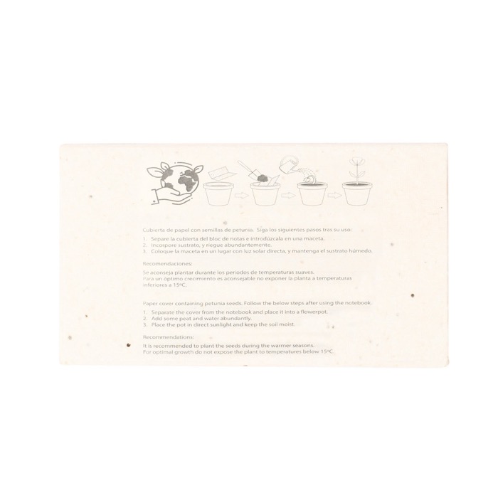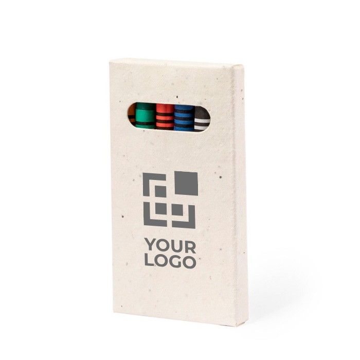 Set de 6 ceras fabricadas en una variada gama de colores, presentadas en una innovadora caja de cartón natural con semillas. La caja incluye semillas de petunia, lo que permite que, al finalizar su uso, el cartón se pueda plantar, promoviendo la sostenibilidad. Las flores resultantes son de colores surtidos, añadiendo un toque de naturaleza y color a cualquier espacio. En la cubierta trasera se encuentran las instrucciones de plantado, facilitando su uso. Ideal para empresas que buscan fomentar la creatividad y la responsabilidad ambiental en sus actividades corporativas o como parte de campañas de marketing ecológicas.