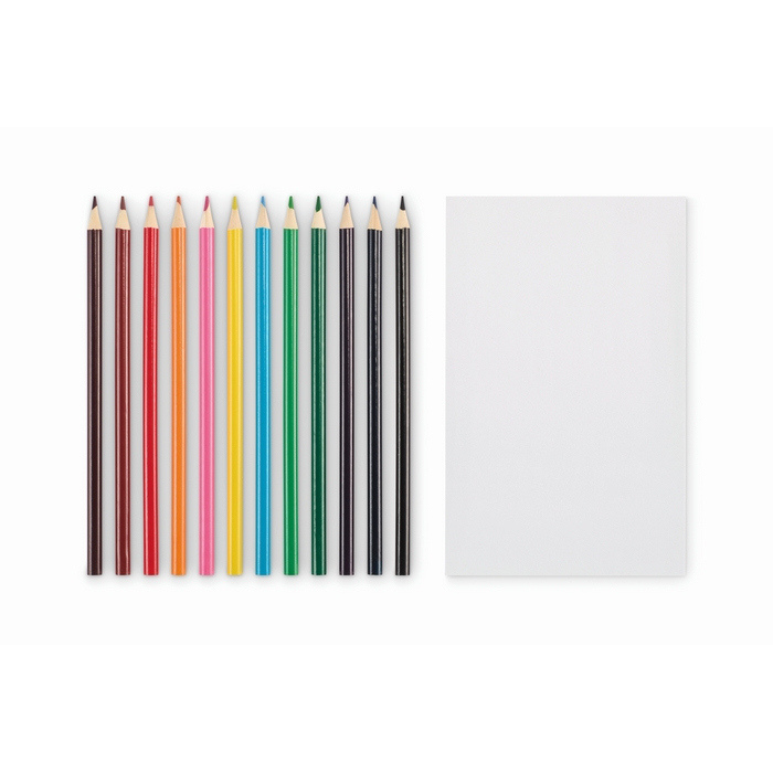 Set de dibujo infantil con 50 hojas y 12 lápices de colores, diseñado para potenciar la creatividad en eventos, capturando la atención de los más pequeños.