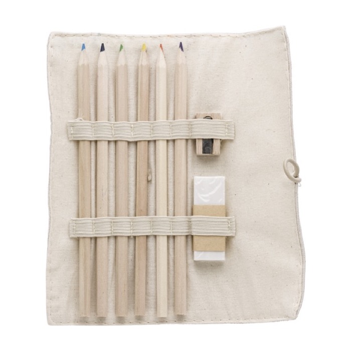 Un regalo que combina el estilo clásico con la practicidad y la preocupación ambiental. Se trata de un estuche enrollable fabricado en lino y algodón que posee un 30-60% de materiales ecológicos. Incluye 6 lápices de colores (azul rayo, azul oscuro, verde, amarillo, naranja y morado), un sacapuntas y una goma de borrar, y dispone de espacios destinados a almacenar cada una de estas herramientas de escritura o dibujo. Su sistema de cierre es a base de una goma y un botón, y una vez enrollado, el estuche queda tan compacto que es ideal para llevar a cualquier sitio de manera cómoda y sencilla. Es compatible para personalizar con tu logotipo mediante diferentes técnicas de marcaje, incluso con transfer digital, logrando resultados a todo color. Tiene el servicio de transporte rápido habilitado.