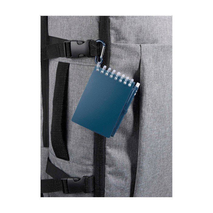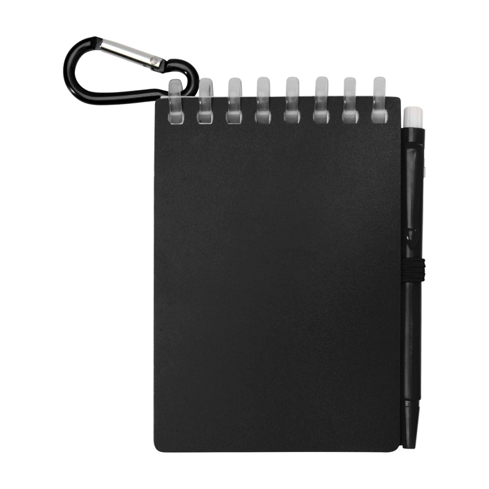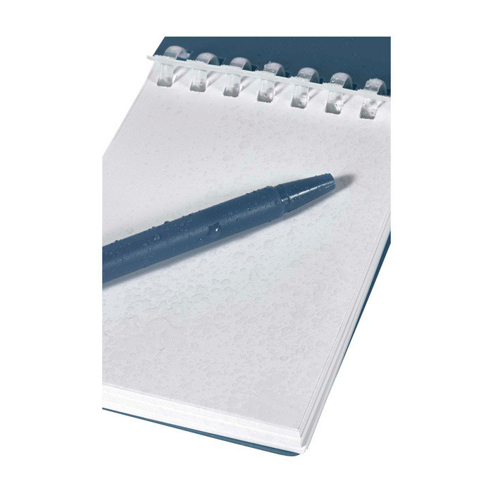 Conjunto de libreta y bolígrafo de plástico reciclado pensado para tomar notas fuera de la oficina. La libreta con encuadernación en espiral incluye 70 hojas en blanco de papel de piedra resistente al agua de 120g/m², con esquinas redondeadas y soporte integrado para llevar el bolígrafo siempre a mano. El bolígrafo a juego, fabricado en plástico, escribe en tinta negra y ofrece una longitud de escritura aproximada de 250 metros. La anilla metálica facilita colgarlo en mochila o llavero para acciones de marketing itinerante.