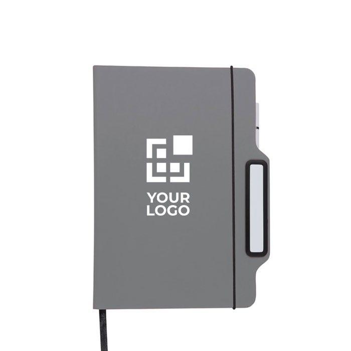 Bloc de notas fabricado en suave PU (poliuretano) con tapas rígidas, ideal para un uso diario en el entorno corporativo. En la portada, se encuentra un práctico soporte para smartphone, facilitando el acceso a dispositivos móviles mientras se trabaja. Incluye un bolígrafo de escritura eterna en color blanco, asegurando una experiencia de escritura fluida y duradera. Con 80 hojas interiores lisas de color crema, ofrece un espacio amplio para anotaciones. El cierre elástico negro y el marcapáginas a juego garantizan que todo se mantenga organizado. Perfecto para reuniones, conferencias o como material promocional en ferias empresariales.