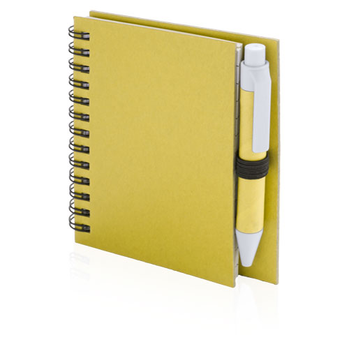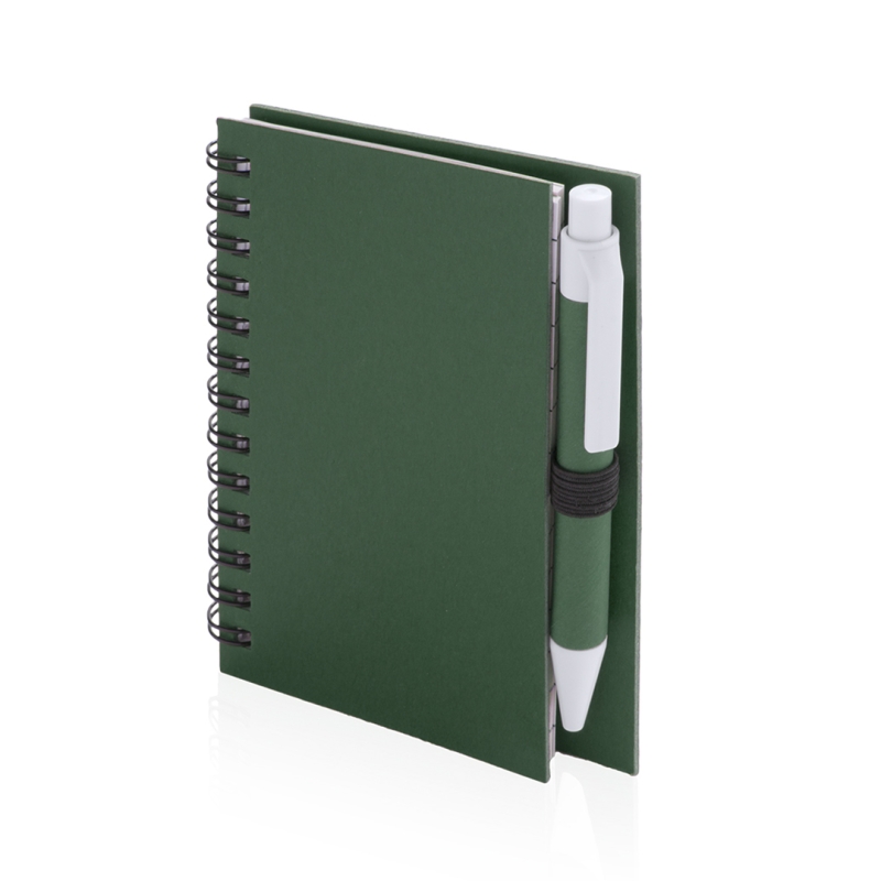 Libreta de anillas fabricada con tapas de suave tacto en resistente cartón reciclado, acompañada de un bolígrafo a juego también en cartón reciclado. Disponible en atrevidos colores, esta libreta cuenta con 50 hojas de formato B7, distribuidas a una raya, ideales para tomar notas rápidas y organizadas. La contraportada incluye un práctico soporte para el bolígrafo, asegurando que siempre esté a mano. La portada rígida proporciona durabilidad y protección a las notas. Suministrada en bolsa individual, aunque el embalaje puede variar para pedidos con impresión personalizada. Perfecta para reuniones corporativas, eventos de marketing o como material promocional sostenible.