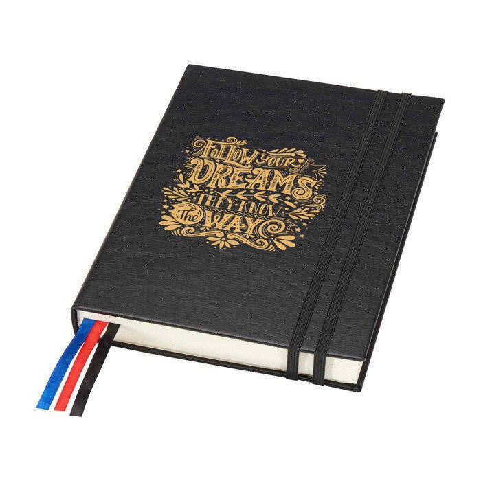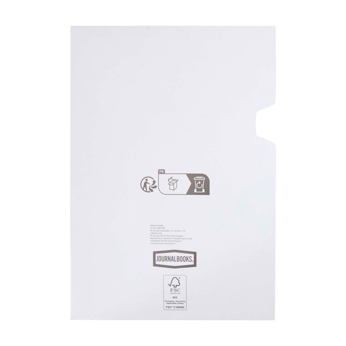 Libreta A5 fabricada en plástico reciclado símil piel, diseñada para empresas que valoran la sostenibilidad y la funcionalidad. Con 192 hojas de papel crema de 80 g/m², esta libreta ofrece un formato de agenda diaria, ideal para planificar y escribir durante todo el año. Incluye dos gomas elásticas para mantenerla cerrada y tres marcapáginas de cinta en negro, rojo y azul, facilitando la organización de tus proyectos. Además, cuenta con 200 notas adhesivas de colores (40 por color) y un práctico bolsillo de papel para guardar notas sueltas. El logotipo gofrado JournalBooks en la contraportada añade un toque de distinción. Se presenta en una funda de papel blanco, perfecta para presentaciones corporativas. Ideal para reuniones, planificación de proyectos o como regalo corporativo.