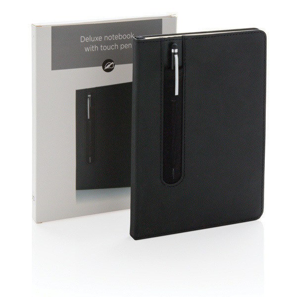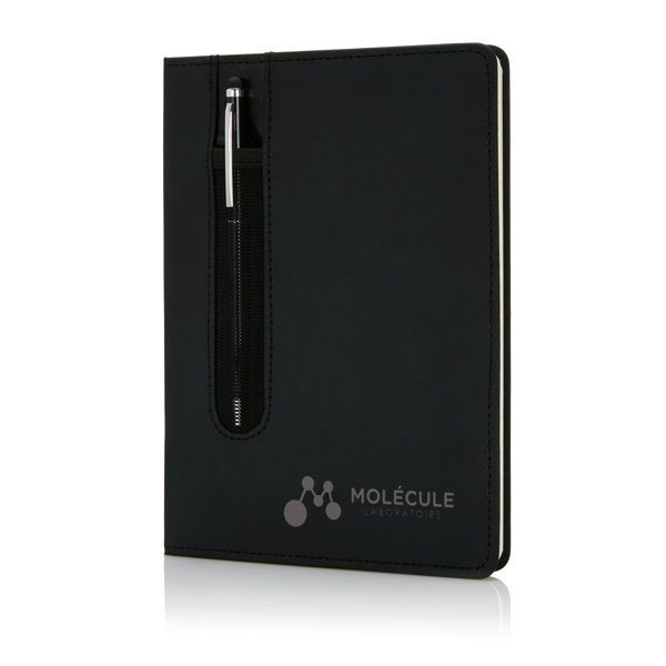 Regala a tus clientes y empleados una mejor experiencia de escritura con nuestra libreta A5 de 160 páginas de 80g/m2, elaborada con cubiertas de piel sintética. Acompañada de un bolígrafo táctil de tinta negra que queda guardado en un bolsillo frontal en la misma portada. Este accesorio se presenta en una caja de regalo individual. Las hojas a rayas ofrecen una estructura organizada para tus notas, mientras que el acabado del cuaderno es elegante. Esta combinación de materiales y diseño hacen de este cuaderno una opción recomendada para regalar en el pack de bienvenida a nuevos empleados.
