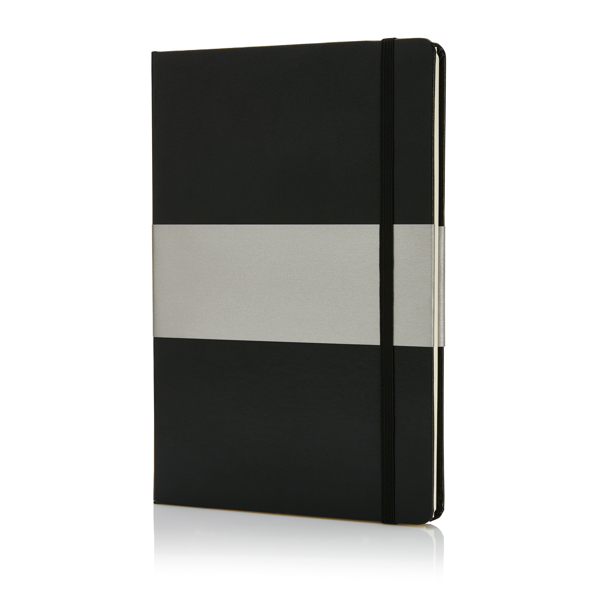 Libreta en formato A5 con un diseño cuidado que se presenta con un elegante papel decorativo alrededor, lo que la hace única y diferente. Esta libreta tiene unas esquinas redondeadas que aportan un acabado más limpio. Su cierre mediante cinta elástica mantiene las páginas protegidas y también evita que se puedan caer otras elementos que se hayan colocado dentro de la libret . El interior cuenta con 160 páginas rayadas en negro sobre papel de 80 g/m², ofreciendo una escritura clara y profesional. Incorpora una cinta divisoria negra que facilita la organización de notas. Una opción atractiva para empresas que buscan artículos útiles y con presencia para reuniones, ferias o como soporte de marca en acciones promocionales.