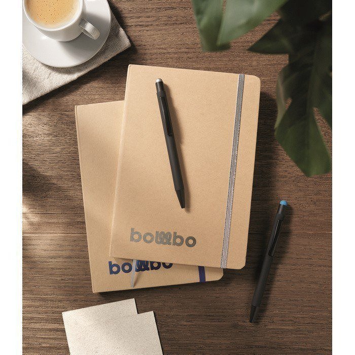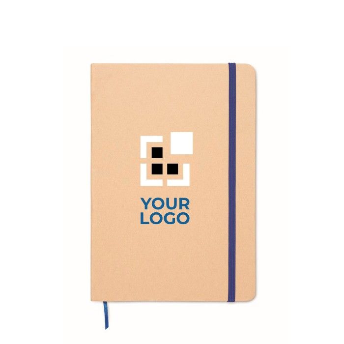Libreta A5 fabricada con tapa de cartón duro reciclado, ideal para empresas que valoran la sostenibilidad. Las cubiertas en color beige ofrecen un aspecto profesional y elegante. Con 160 páginas de papel reciclado rayado, esta libreta es perfecta para tomar notas en reuniones o planificar proyectos. Incluye una banda elástica y una cinta marcapáginas a juego, asegurando que tus documentos estén siempre organizados. La opción de grabado láser permite personalizarla con el logo de tu empresa, revelando un color brillante que resalta en la impresión. Ideal para regalos corporativos o material promocional, con servicio Express disponible para necesidades urgentes.