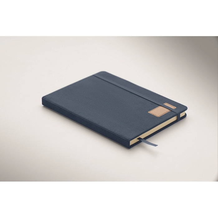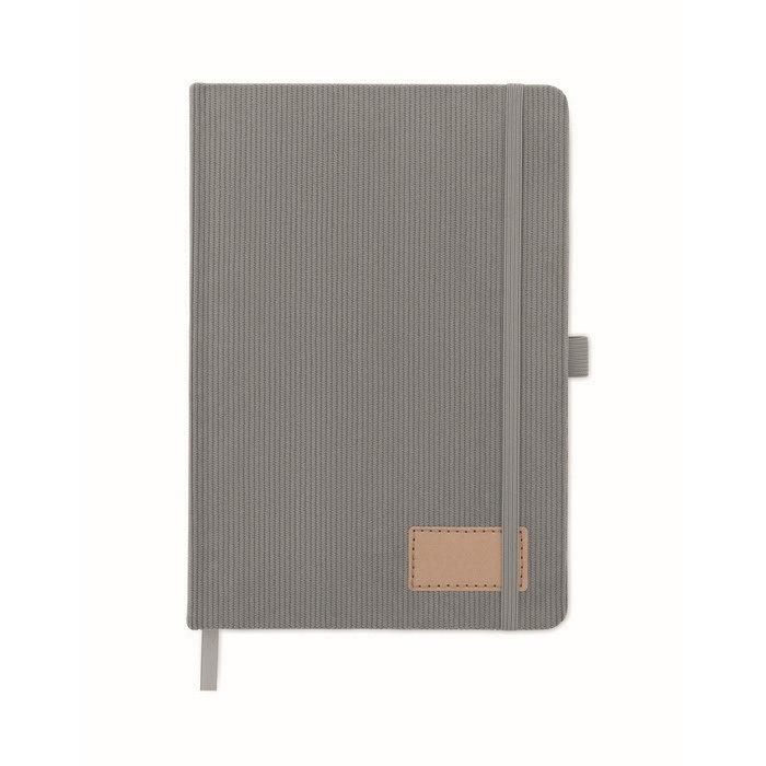 Libreta A5 con cubierta de pana dura de poliéster RPET y diseño en cartoné para un uso diario en oficina o visitas comerciales. Incorpora 192 páginas de papel reciclado rayado de 70 g/m², pensadas para tomar notas con orden en reuniones y formaciones. Incluye banda elástica para mantenerla cerrada y cinta marcapáginas para localizar rápidamente la última anotación. La etiqueta de papel kraft lavado aporta un acabado discreto. Opción práctica para kits de bienvenida, eventos y acciones de marca.