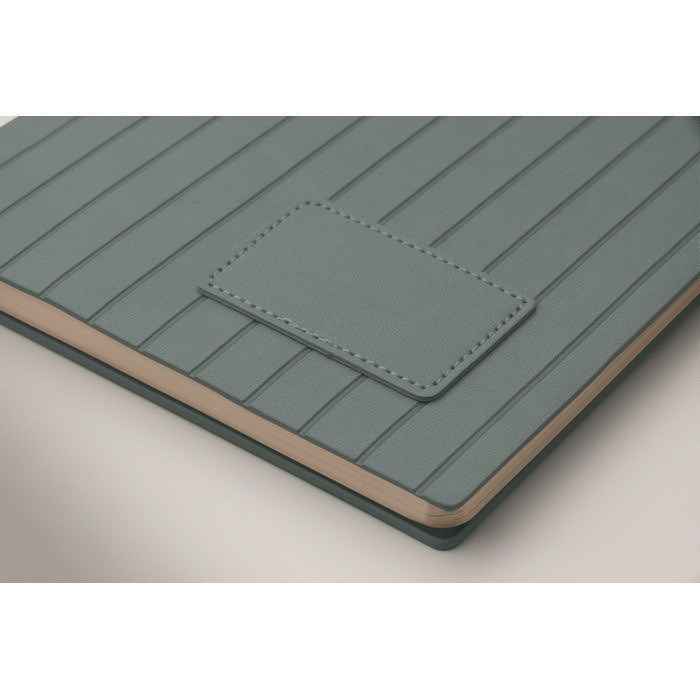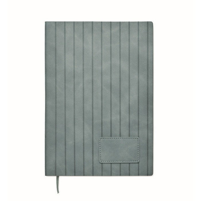 Libreta A5 fabricada con una suave cubierta acanalada de PU (poliuretano) ahumado, compuesta en un 40% por material reciclado postconsumo y un 60% de PU, complementada con un parche de PU liso. Contiene 160 páginas rayadas, elaboradas con papel reciclado de 70 g/m², distribuidas en 80 hojas. Incluye un marcapáginas de cinta de poliéster del mismo color que la cubierta, facilitando la organización y el acceso rápido a las notas importantes. Ideal para empresas que buscan reforzar su imagen sostenible, esta libreta es perfecta para reuniones, conferencias o como obsequio corporativo que combina elegancia y funcionalidad.