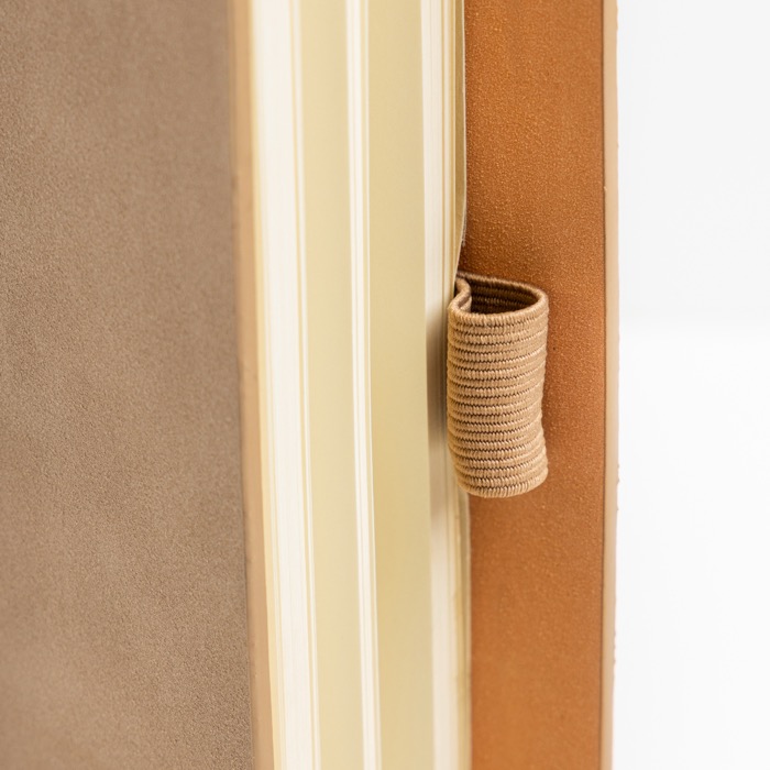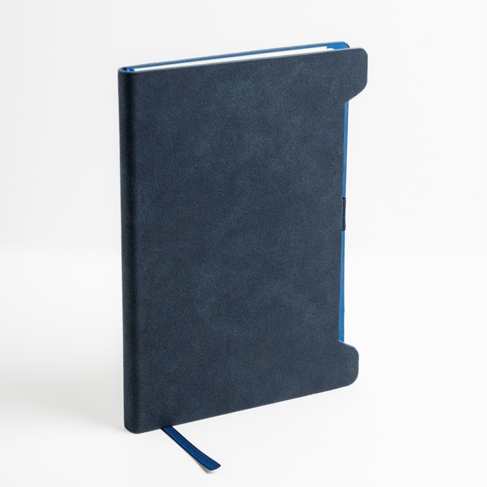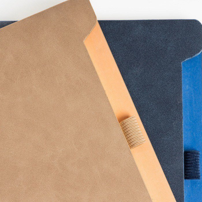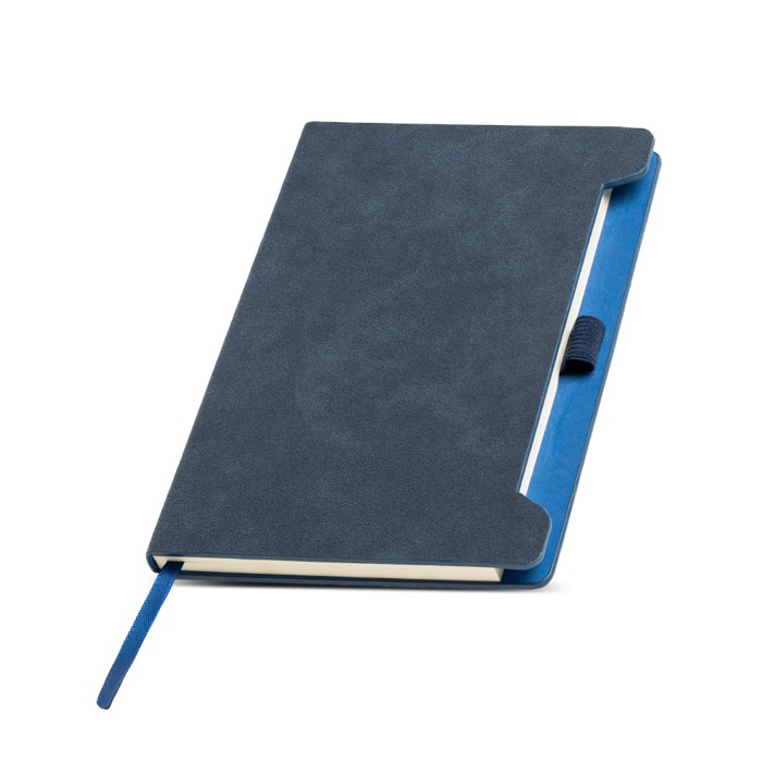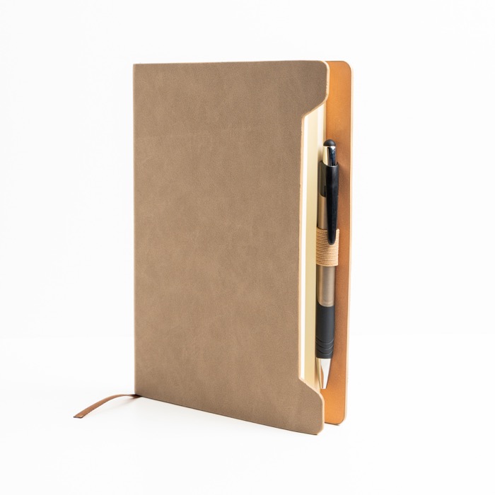 - Libreta A5 con cubierta de RPU suave y soporte para bolígrafo