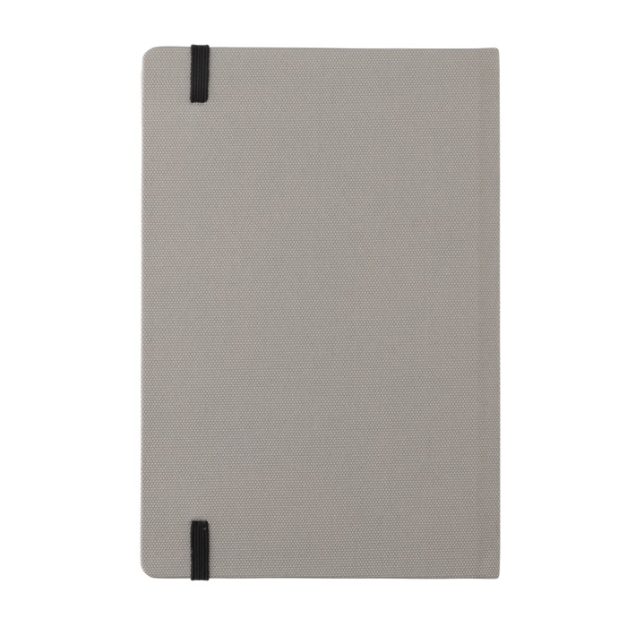 Cuaderno con portada y páginas interiores fabricadas con materiales certificados 100% GRS (Global Recycled Standard). La certificación GRS asegura una cadena de suministro completamente certificada de materiales reciclados, con un contenido reciclado total del 68% basado en el peso total del artículo. Este cuaderno cuenta con 80 hojas, equivalentes a 160 páginas rayadas, con un gramaje de 70 g/m², ideal para una escritura fluida y cómoda. El formato A5 lo hace práctico para llevar a cualquier reunión o evento. Incluye un elástico para el cierre en un tono de color distinto, añadiendo un toque de estilo y funcionalidad. Suministrado en bolsa y a granel, es perfecto para empresas que buscan opciones sostenibles para sus necesidades de papelería o como parte de un kit de bienvenida corporativo.