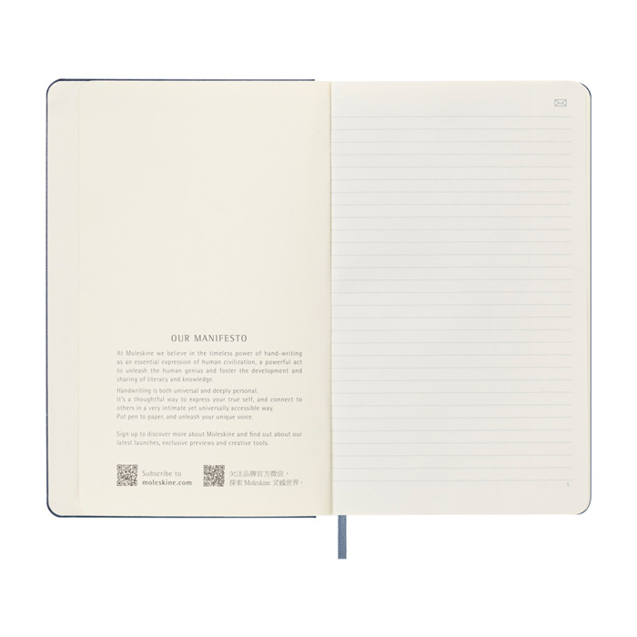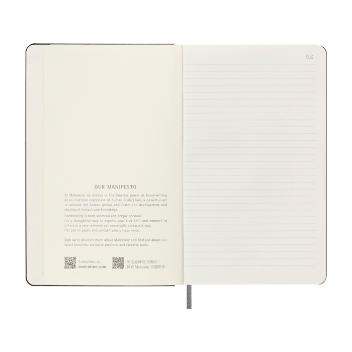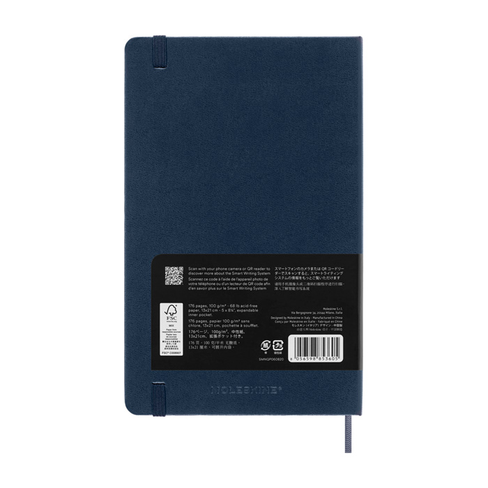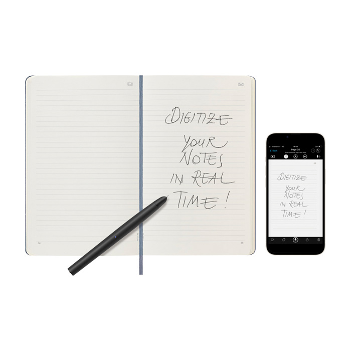 La libreta grande e inteligente ”Moleskine” tiene una tapa dura de estilo clásico con esquinas redondeadas y papel de color marfil. Cada página contiene Ncodes invisibles con los que el bolígrafo inteligente crea una copia digital instantánea de cada palabra y boceto en la aplicación Moleskine Notes. La libreta también contiene la historia de ”Moleskine”.