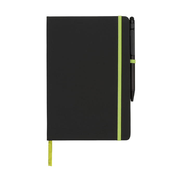 Libreta A5 de PU (poliuretano) perfilada en color, acompañada de un bolígrafo stylus. Esta moderna y elegante libreta negra cuenta con una suave tapa táctil que ofrece una experiencia de uso agradable. Los ribetes de color, el marcapáginas, el soporte para bolígrafo y la tira de cierre a juego añaden un toque de distinción. Incluye un bolígrafo-stylus negro, ideal para escritura y uso en dispositivos táctiles. Con 96 hojas de papel rayado en tono crema (70 g/m²), es perfecta para tomar notas de manera organizada. Se suministra en una bolsa individual, asegurando su protección. La tinta negra garantiza una escritura clara y profesional. Ideal para reuniones corporativas o como material promocional en eventos empresariales.