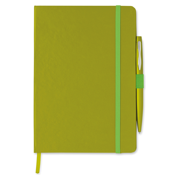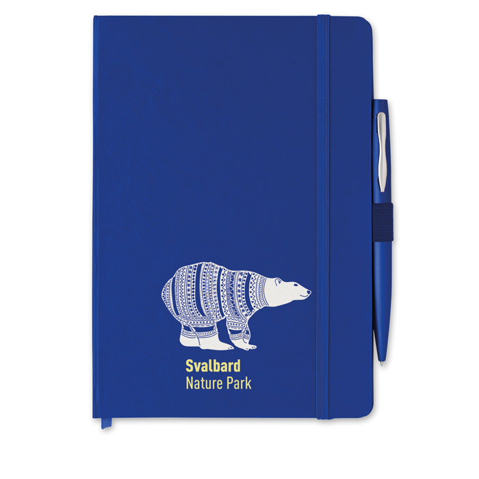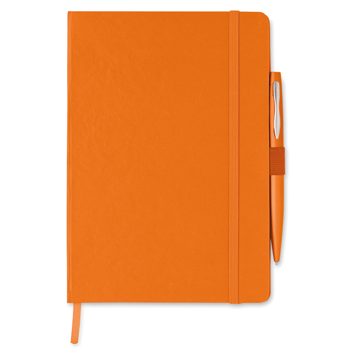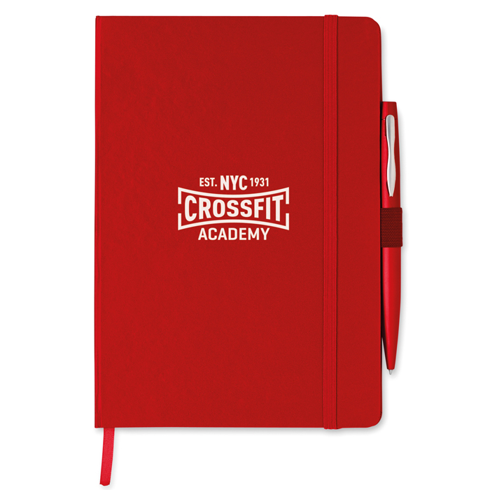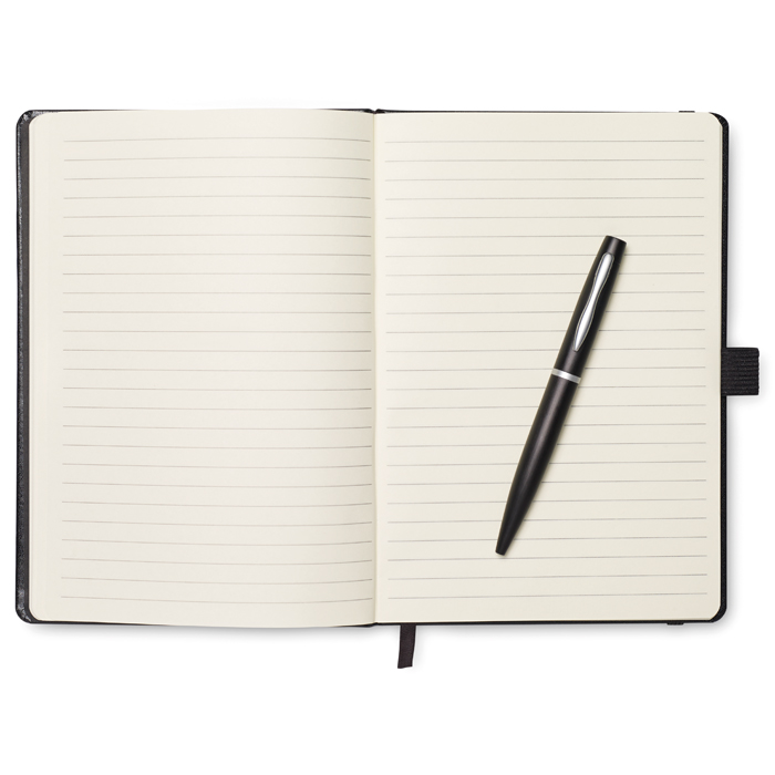 - Libreta A5 con tapa rígida y bolígrafo incluido