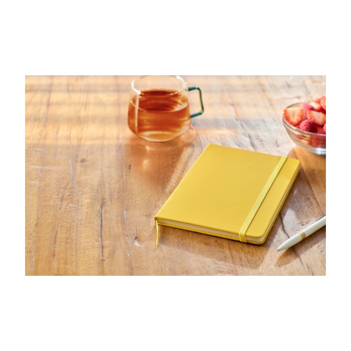 Libreta de RPET con tapa dura de RPET PU, diseñada en un práctico formato A5. Contiene 80 páginas rayadas de 70 g/m², ideales para tomar notas de manera organizada. La banda elástica y la cinta a juego no solo añaden un toque de estilo, sino que también aseguran que tus documentos se mantengan en su lugar. El logotipo termograbado en la parte trasera destaca su compromiso con el uso de materiales reciclados. Perfecta para empresas que buscan reforzar su imagen sostenible, esta libreta es ideal para reuniones, conferencias o como obsequio corporativo.