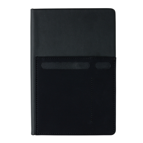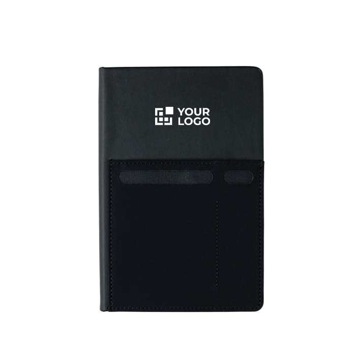 Da a tus clientes o empleados un objeto publicitario práctico y de diseño al regalar esta libreta A5, que se convierte en una herramienta esencial para quienes valoran la organización. Con 160 páginas a rayas de 80 g/m2 en un tono crema. La tapa delantera, elaborada en cuero y piel de imitación, no solo aporta un acabado refinado, sino que también integra un compartimento para teléfonos de hasta 8 cm, siendo compatible con varios modelos teléfonos móviles. Además, cuenta con un soporte dedicado para bolígrafos y un espacioso bolsillo para documentos, asegurando que todo lo que necesita tu equipo lo tiene al alcance.