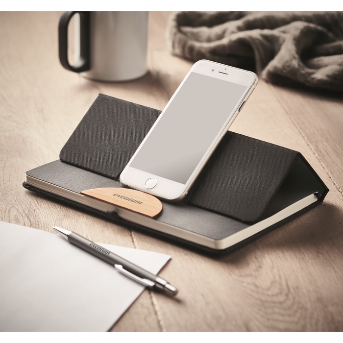 Libreta A5 con soporte para smartphone y detalles de bambú
