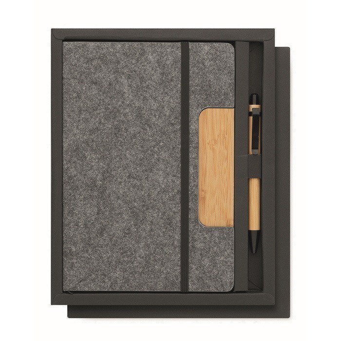 Juego de libretas A5 de fieltro RPET con tapa dura, diseñado para optimizar la organización en el entorno laboral. Incluye un soporte práctico para teléfono y un bolígrafo de bambú, ideal para tener siempre a mano. Con 160 páginas rayadas de papel reciclado, ofrece un espacio amplio para anotaciones diarias. La cinta elástica asegura un cierre firme, mientras que el marcapáginas de cinta facilita el acceso rápido a las notas importantes. La tinta azul proporciona una escritura clara y profesional. Perfecto para reuniones, conferencias o como parte de un kit de bienvenida corporativo. Disponible con servicio Express para necesidades urgentes.