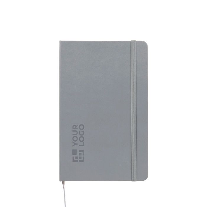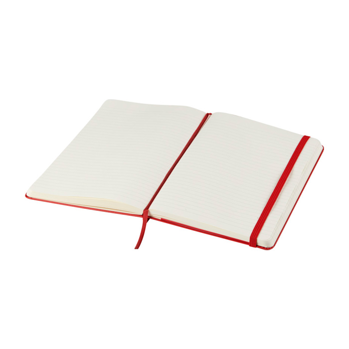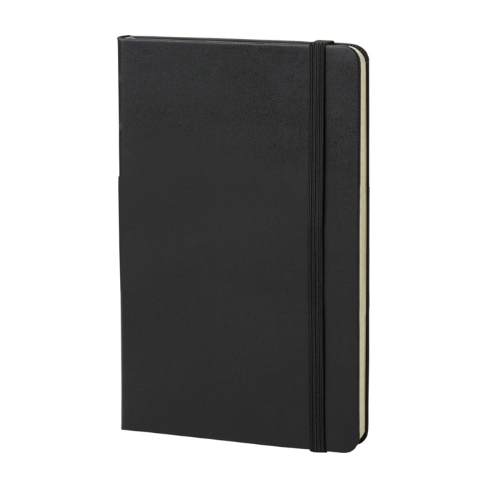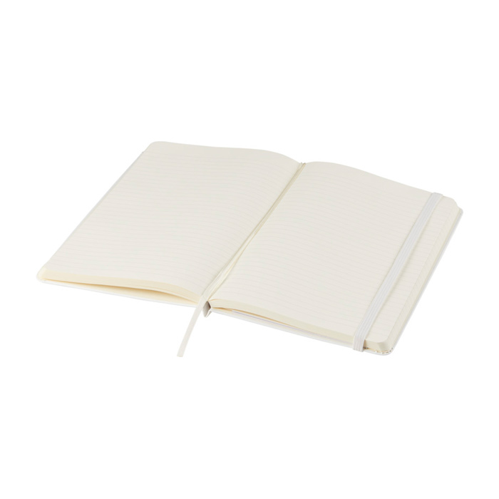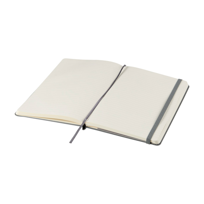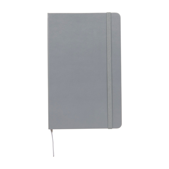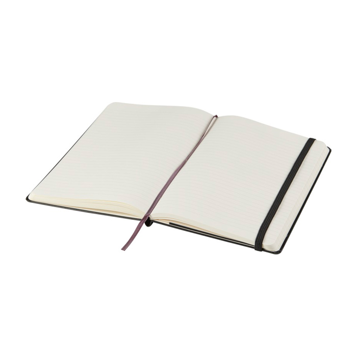 Libreta de tapa dura con cubierta encuadernada de cartón y esquinas redondeadas, pensada para un uso diario ordenado. Incluye 240 páginas rayadas en papel color marfil libre de ácido, una solución práctica para tomar notas sin que el papel amarillee con el tiempo. Incorpora marcador de cinta para retomar rápidamente y cierre elástico para mantenerla protegida en bolso o mochila. Añade bolsillo interior extensible para guardar tarjetas y apuntes sueltos. Opción adecuada para eventos corporativos, formación interna o regalos de bienvenida con logo.