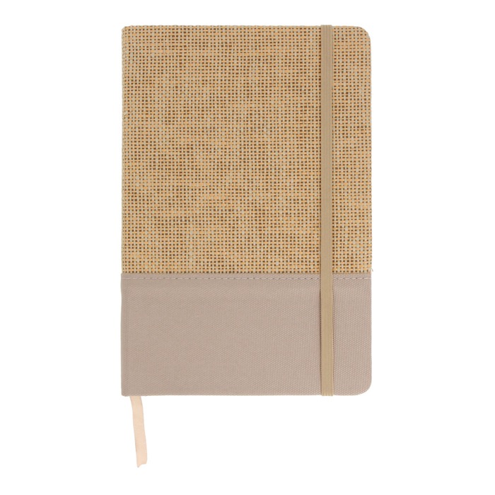 Cuaderno de yute y R-PET con 80 hojas a rayas, cada una con un gramaje de 70 g/m². La cubierta combina yute natural y R-PET, ofreciendo una opción duradera y respetuosa con el medio ambiente. Las páginas cuentan con la certificación FSC (Forest Stewardship Council), garantizando que provienen de fuentes responsables. Además, el cuaderno tiene la certificación GRS (Global Recycled Standard), asegurando el uso de materiales reciclados. Ideal para empresas que buscan integrar prácticas sostenibles en su día a día, este cuaderno es perfecto para reuniones, conferencias o como parte de un kit de bienvenida corporativo.