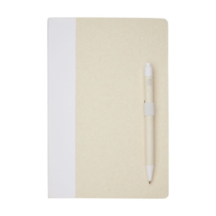 Conjunto de cuaderno y bolígrafo fabricados a partir de cartones de leche reciclados, un enfoque sostenible que aprovecha hasta un 70% de material reciclado. La libreta, en formato A5, cuenta con 80 hojas a rayas de 80 g/m², ideales para tomar notas claras y organizadas. El bolígrafo, con cuerpo de cartón reciclado, incluye detalles de plástico en el botón, la pinza y la punta, y ofrece una escritura fluida en tinta negra. Sin embalaje individual, este conjunto es una opción práctica y ecológica. Perfecto para empresas que buscan productos sostenibles para sus oficinas o como obsequios corporativos.