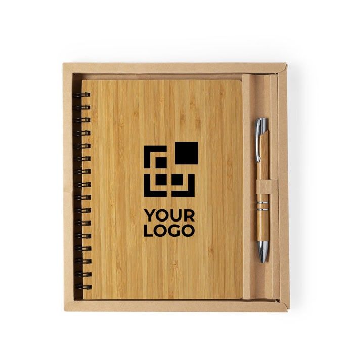 Set compuesto por libreta de anillas y bolígrafo, con un diseño natural que combina materiales sostenibles y presentación cuidada. La libreta cuenta con tapas rígidas de bambú y 80 hojas rayadas, para notas o reuniones. El bolígrafo, también en bambú, incluye detalles metálicos y mecanismo pulsador, con tinta negra. Todo el conjunto se presenta en un estuche de cartón troquelado que refuerza su valor como regalo. Una propuesta atractiva para quienes buscan artículos útiles para recibir a nuevas incorporaciones al equipo o para llevar como regalo a una feria del sector.