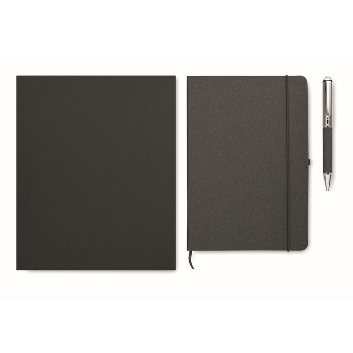 Set de regalo compuesto por una libreta A5 de piel reciclada (75%) con tapa dura y un bolígrafo metálico giratorio. La libreta cuenta con 160 páginas rayadas, distribuidas en 80 hojas, y está equipada con una banda elástica a juego, cinta marcapáginas y portabolígrafos, lo que facilita su uso diario. El bolígrafo, con tinta azul, complementa el conjunto, ofreciendo una experiencia de escritura fluida. Todo el set se presenta en una caja de papel kraft, subrayando su compromiso con la sostenibilidad. Ideal para empresas que buscan regalos corporativos prácticos y responsables, este set puede ser utilizado en eventos, conferencias o como obsequio para clientes y empleados.