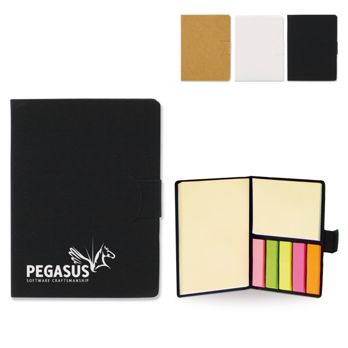 Block de notas con tiras adhesivas, fabricado en material resistente, disponible en portada blanca, negra o marrón. Cada block contiene 50 hojas en blanco, ideales para tomar notas rápidas o hacer listas de tareas. Las tiras adhesivas permiten pegar y despegar las hojas fácilmente, facilitando la organización y el seguimiento de proyectos. Su diseño clásico en colores sobrios transmite formalidad y profesionalismo, adecuado para cualquier entorno de oficina. Perfecto para reuniones, planificación de proyectos o como herramienta de marketing en eventos corporativos.