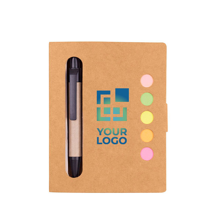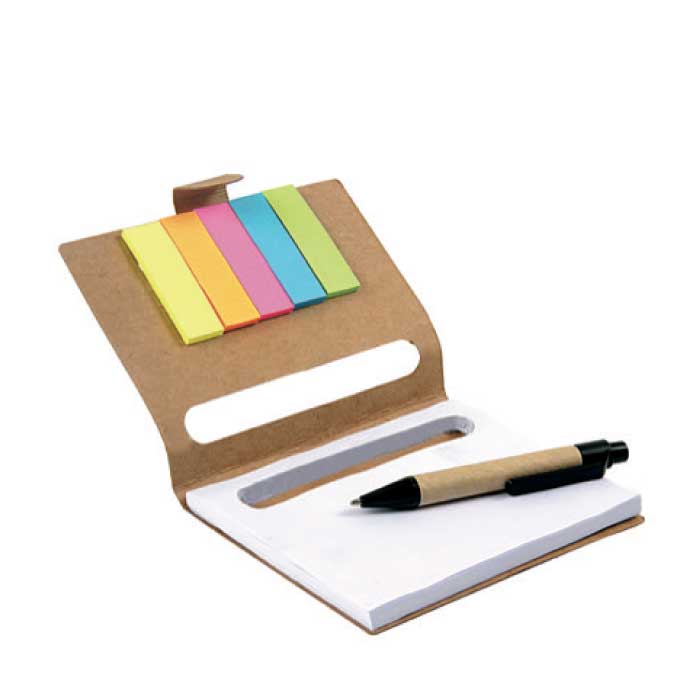 - Incluye notas adhesivas en cinco colores y bolígrafo a juego