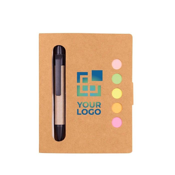 Bloc de notas fabricado en cartón reciclado, ideal para empresas que valoran la sostenibilidad. Contiene 50 páginas lisas, perfectas para tomar notas rápidas o hacer bocetos. Incluye notas adhesivas en cinco colores variados, útiles para marcar páginas o resaltar información importante. Acompañado de un bolígrafo pequeño de 9,5 cm con tinta azul, que se integra perfectamente en el conjunto. Sin embalaje individual, lo que refuerza su compromiso ecológico. Este práctico bloc es perfecto para reuniones, conferencias o como material promocional en eventos corporativos, destacando el compromiso de la empresa con el medio ambiente.
