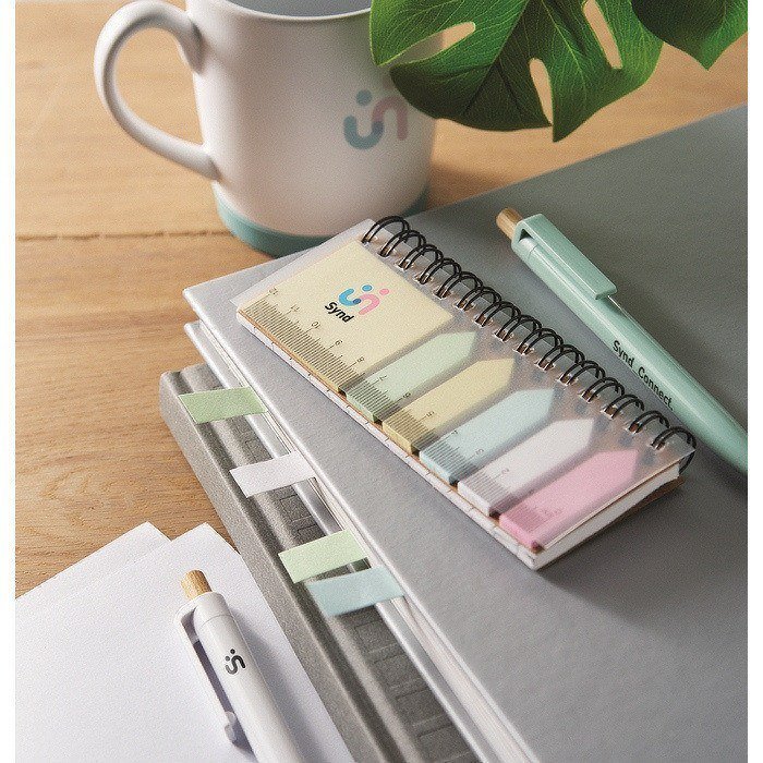 Set de notas con anillas en PP que incluye bloc de notas adhesivas y 5 marcapáginas de colores surtidos en papel reciclado. Formato compacto para llevar en bolso, mochila o maletín y tener siempre a mano recordatorios, marcadores y apuntes rápidos. Las anillas ayudan a mantener el conjunto ordenado y facilitan el uso en reuniones o visitas. Opción práctica para acciones de oficina, eventos corporativos o packs de bienvenida.