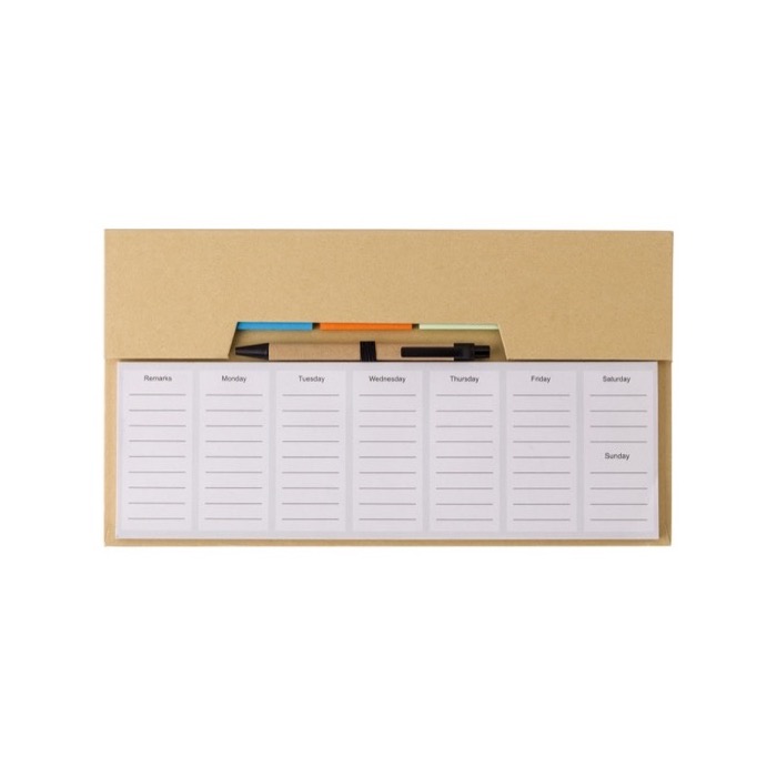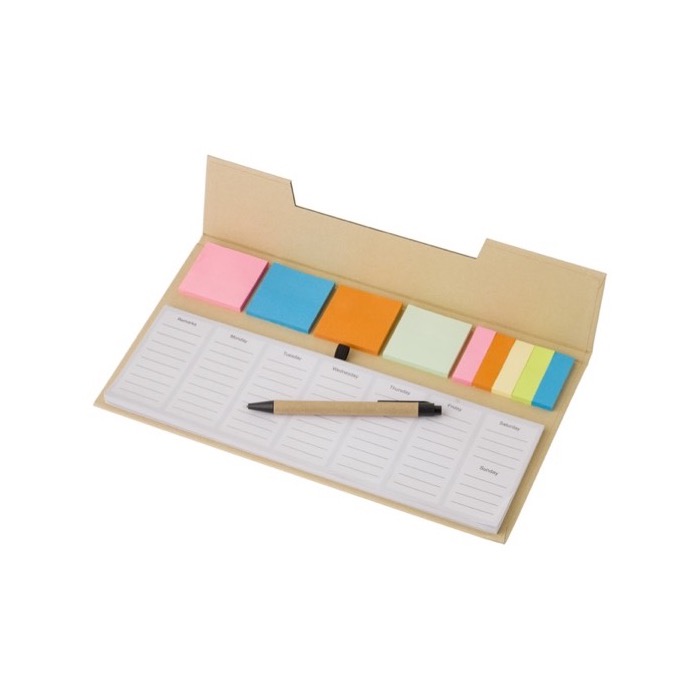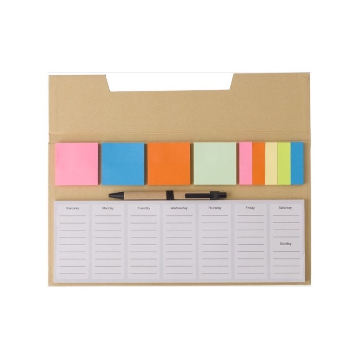 Set con bloc, notas adhesivas, bolígrafo y planificador semanal Memo