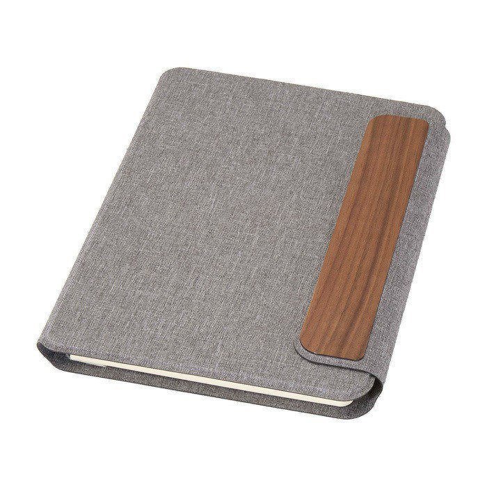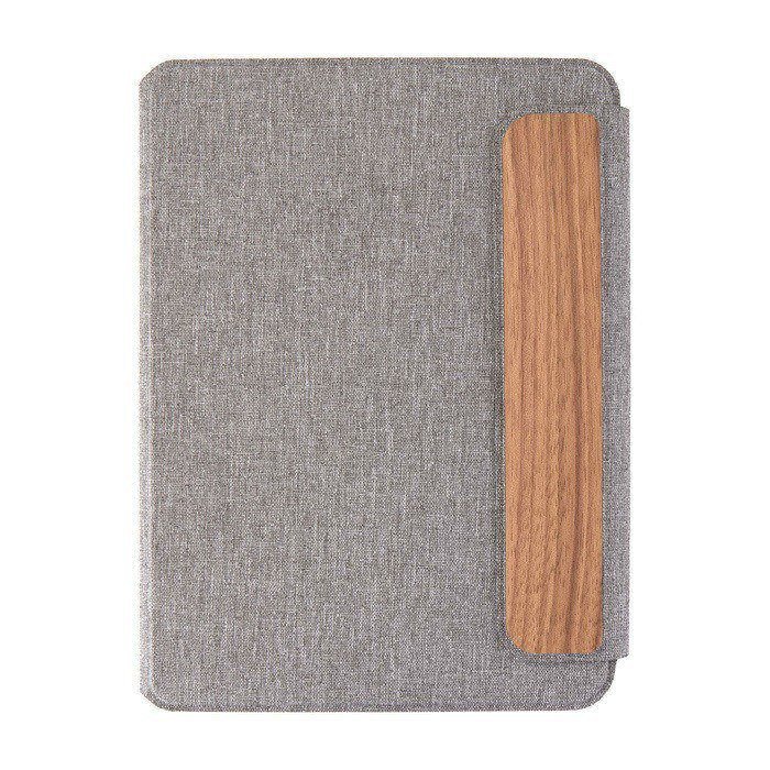 - Cubierta rígida gris con cierre magnético en madera de nogal