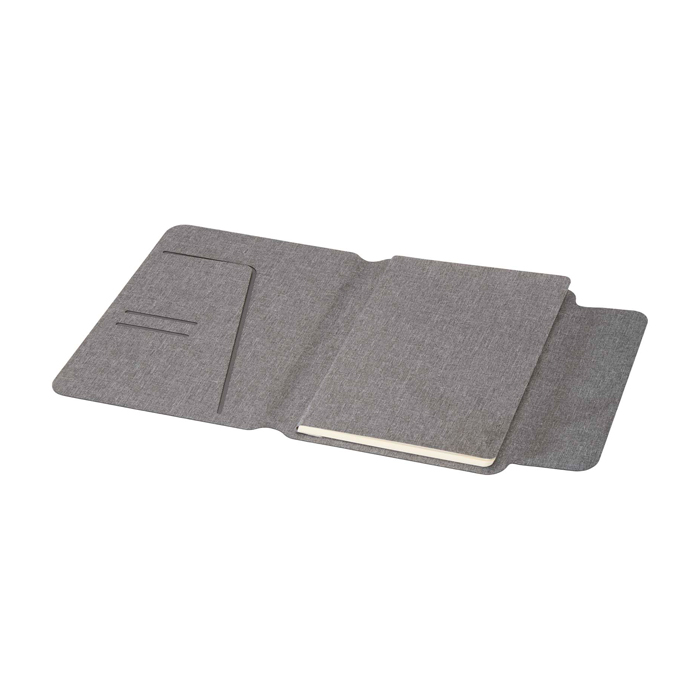 Portafolios A5 fabricado en parte con poliéster reciclado posconsumo, certificado por el Recycled Claim Standard (RCS), ofrece una opción más sostenible al disminuir el uso de materiales vírgenes. Su cubierta rígida gris, con esquinas redondeadas y tecnología de soldadura de precisión, asegura un diseño elegante y duradero. El cierre magnético, adornado con un detalle en madera de nogal, aporta un toque moderno y distintivo. En su interior, una libreta de tapa blanda extraíble con 64 hojas rayadas en color crema, hechas de papel de 80 g/m² de fuentes responsables, ofrece un espacio ideal para notas. Se entrega en una funda de papel kraft, subrayando su carácter práctico y sostenible. Ideal para reuniones y presentaciones empresariales, este portafolio combina funcionalidad y estilo.