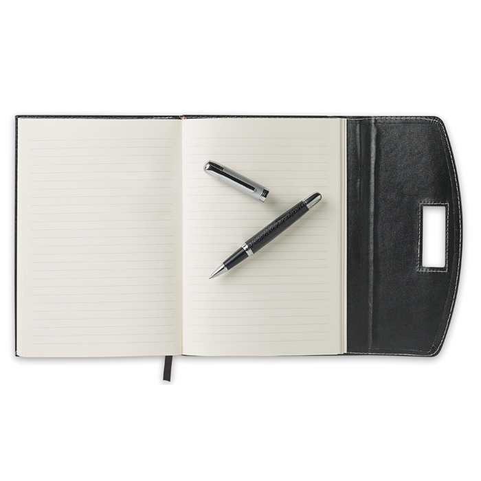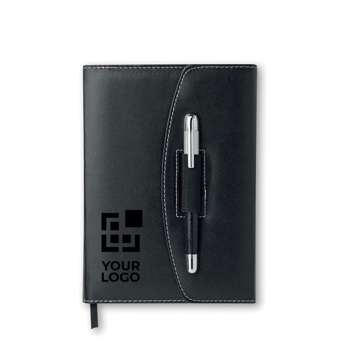 Completa tu set de oficina con este portafolios de tamaño A5 hecho de material PU. En concreto, se trata de un diseño elegante en color negro que al estar cerrado simula una cartera. Incluye un bloc de 60 hojas a rayas y un bolígrafo metálico de tinta negra. Además, el portafolios integra una goma, también negra, para almacenar y transportar el bolígrafo. Un detalle de estilo profesional que podrás personalizar con tu logotipo tanto en la superficie del portafolio como en el tapón del bolígrafo.