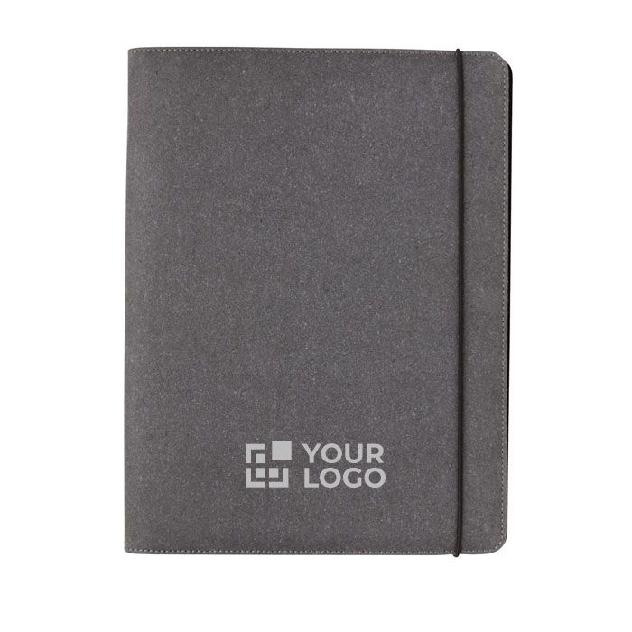 Si tu empresa quiere promocionar la sostenibilidad con estilo este portafolio A4 está confeccionado en cuero reciclado. En su interior, alberga un bloc de notas de papel reciclado con 20 páginas rayadas de 64 g/m², ofreciendo un espacio generoso para tus anotaciones. La disposición interna es meticulosa: un amplio bolsillo, tres compartimentos del tamaño de un móvil y cuatro ranuras para tarjetas de visita, todo diseñado para mantener tus esenciales organizados con distinción. Su presentación en una caja de regalo añade un toque de sofisticación y demuestra preocupación por los detalles desde el primer momento. Y, por si fuera poco, este portafolio con elástico de cierre puede personalizarse con tu logo en ambas caras.