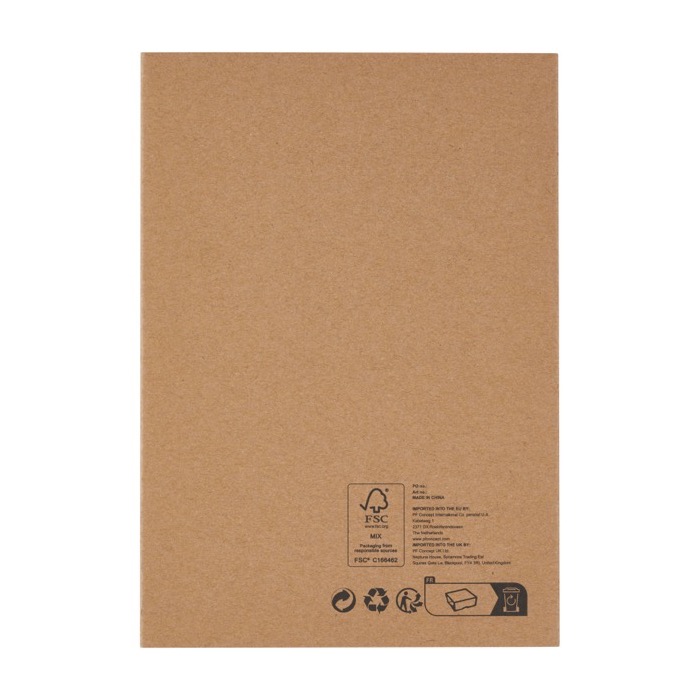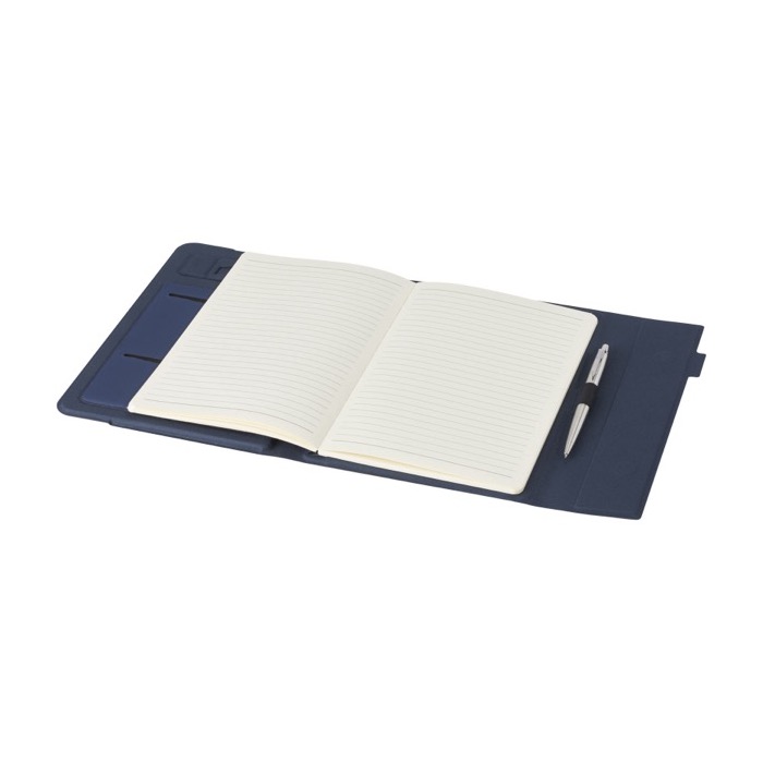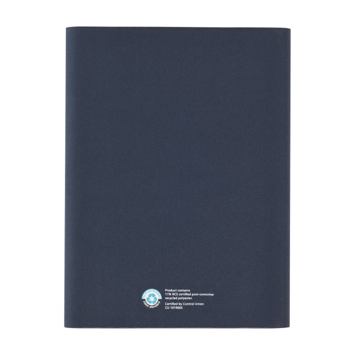 Organizador fabricado parcialmente con poliéster posconsumo reciclado, certificado por RCS (Recycled Claim Standard), lo que lo convierte en una opción más sostenible al disminuir el uso de materia prima virgen. Incluye un práctico soporte para móvil y un espacio para bolígrafo, además de un bolsillo en acordeón para guardar documentos. Contiene 64 hojas rayadas de papel reciclado en color crema, de 80 g/m², provenientes de fuentes sostenibles. El bolígrafo y otros accesorios no están incluidos. Se entrega en una funda de papel individual. Ideal para empresas que buscan soluciones organizativas sostenibles y prácticas, perfectas para reuniones o eventos corporativos.