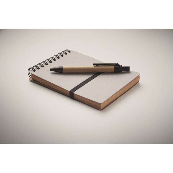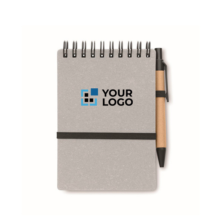 Libreta reciclada con bolígrafo a juego para destacar tu marca en ferias